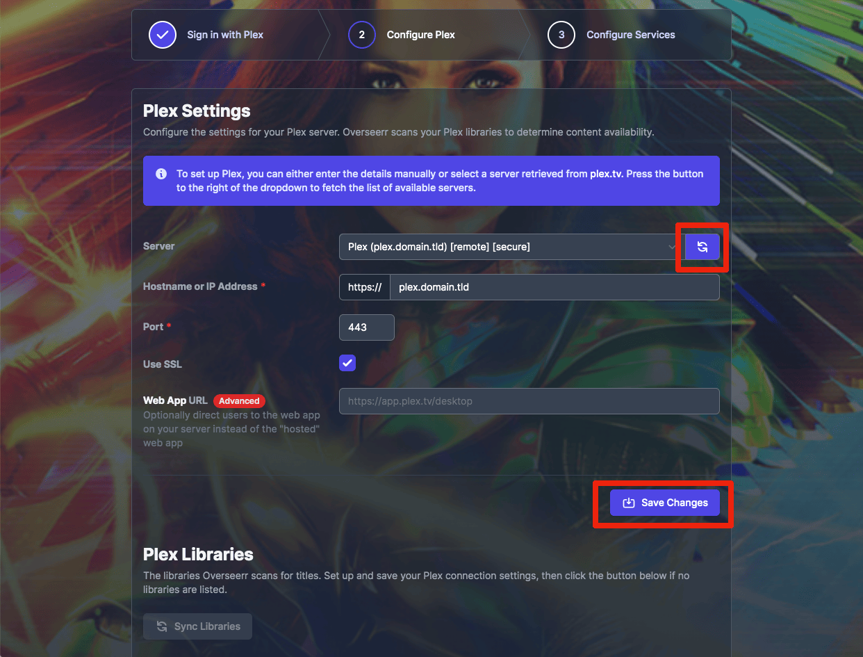 1. Click the "refresh" icon, then select your Plex server from the dropdown. Click "Save Changes" to retrieve the libraries from Plex.