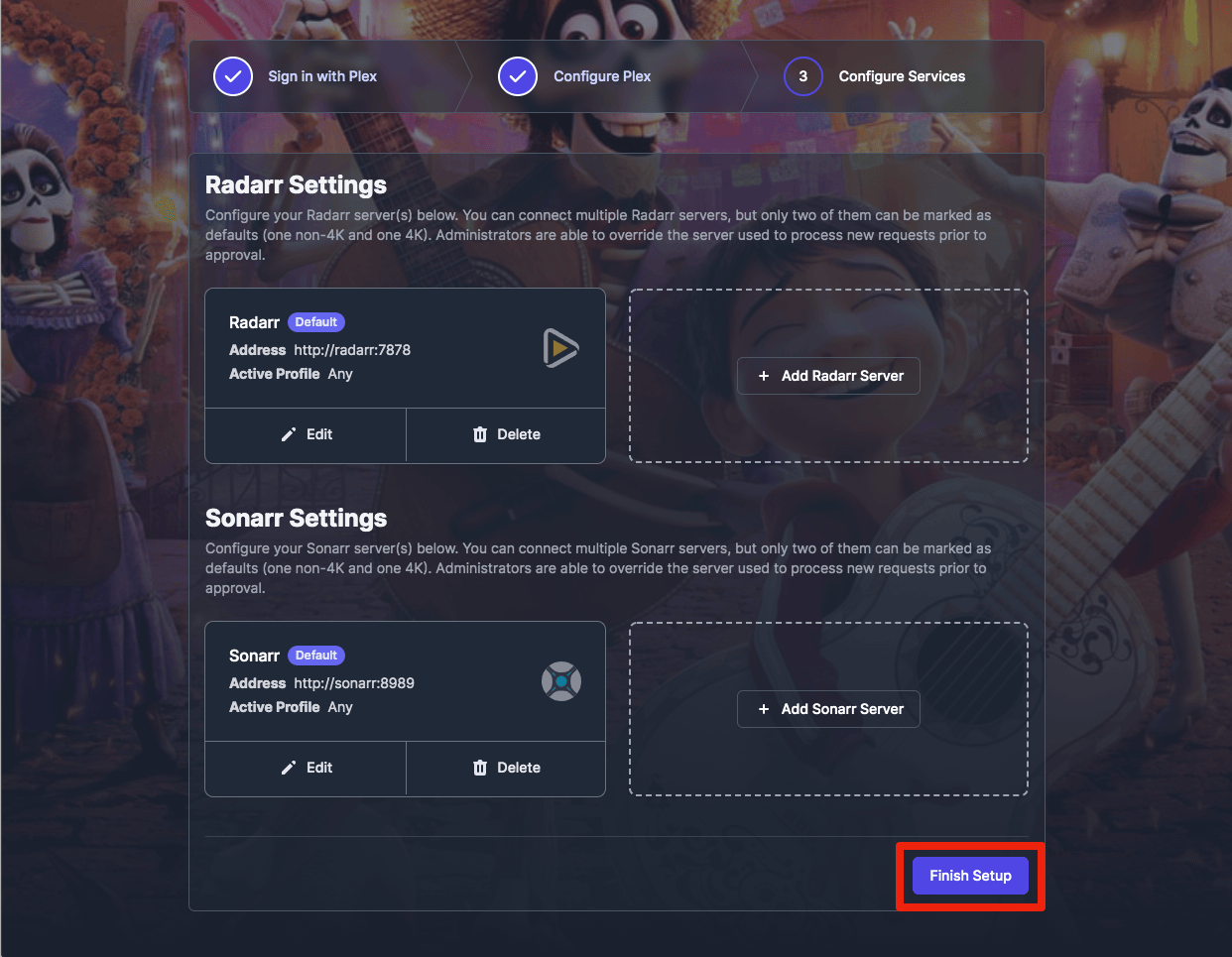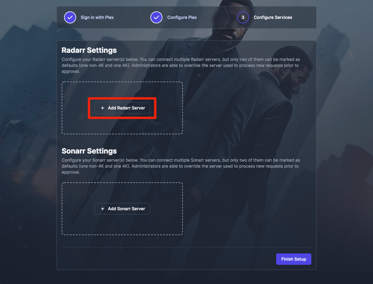This setup needs to take place AFTER you've set up Plex, Radarr, and Sonarr, since it involves connections to all three of those.