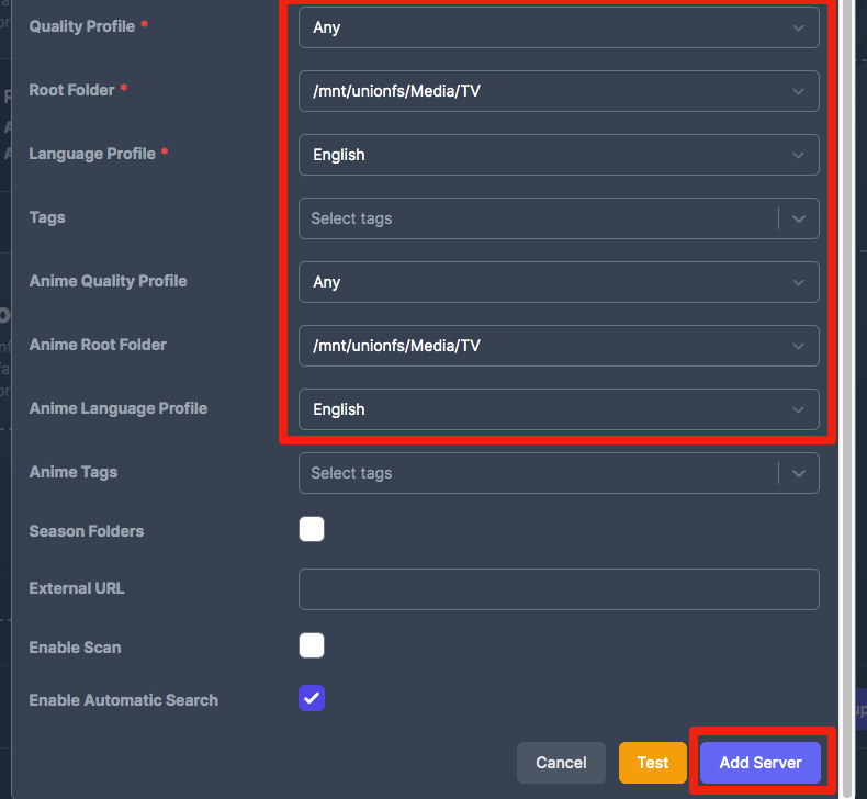 1. Select a Quality, Root Folder, and Minimum Availability for standard and Anime series. Click "Add Server".