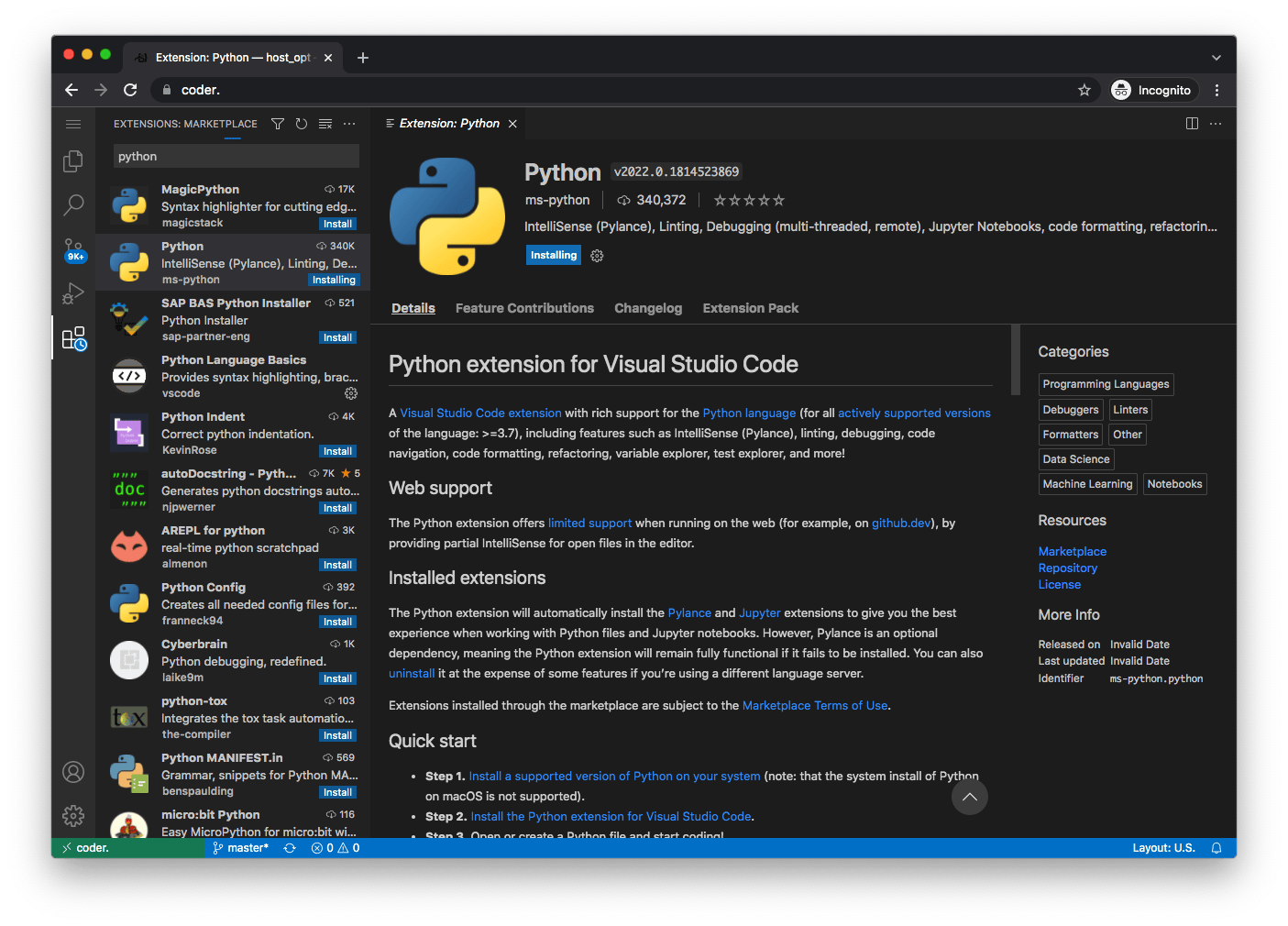Click on the Extensions icon on the left, then type the name of the extension into the search box, and click the "install" button.